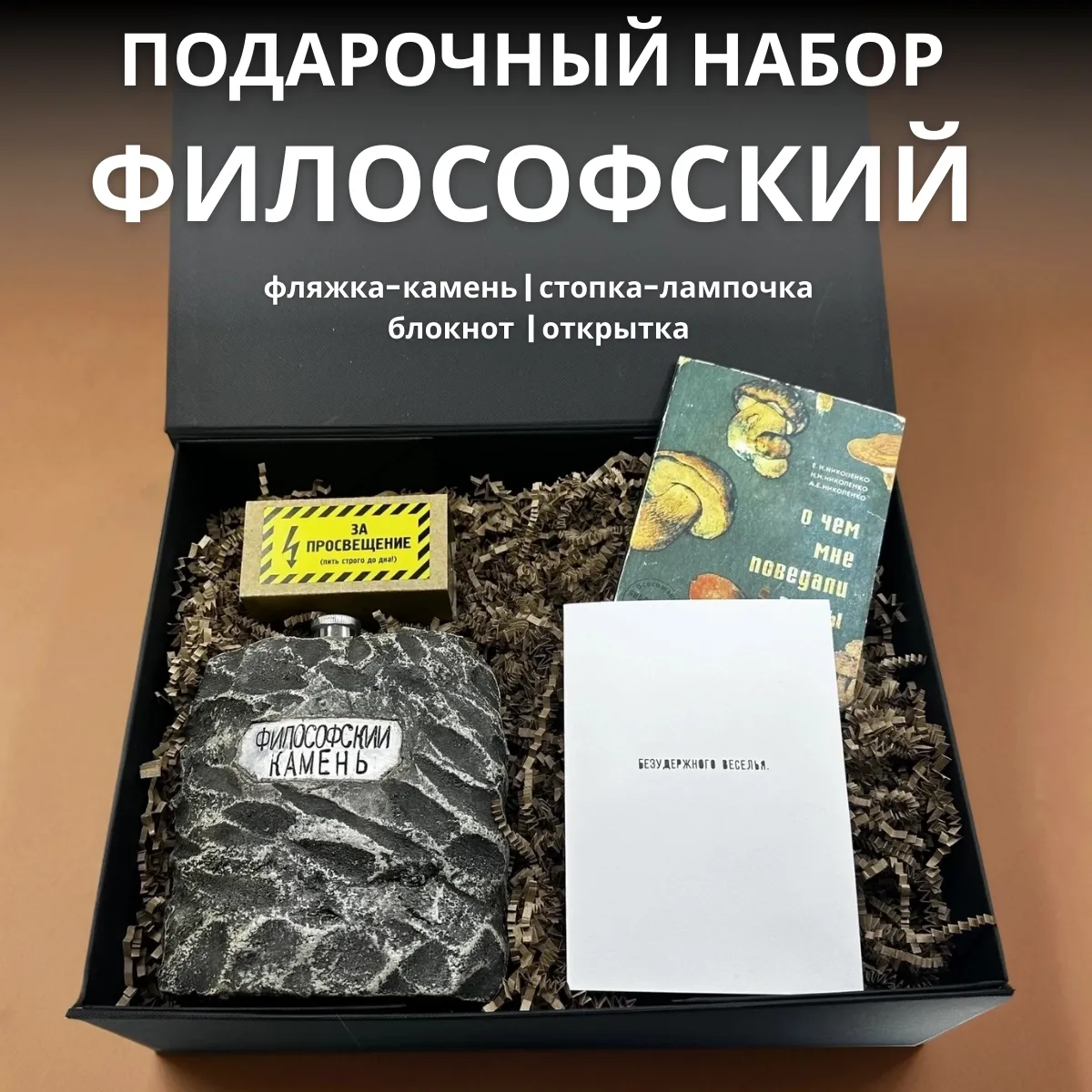 Фляга "Философский камень", стопка из настоящей лампочки "ЗА просвещение", блокнот "О чем мне поведали грибы", Открытка, Подарочная коробка.