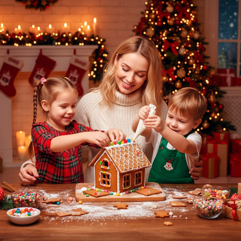 Вкусный и творческий подарок, который можно собрать всей семьёй. Малыши любят украшать домик глазурью и потом гордо угощать друзей.