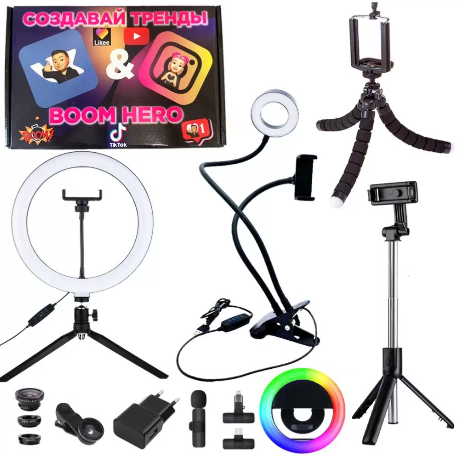 Микрофон, штатив, свет - всё, чтобы начать снимать ролики, стримы и вести свой канал. Подарок для будущей звезды TikTok или YouTube.