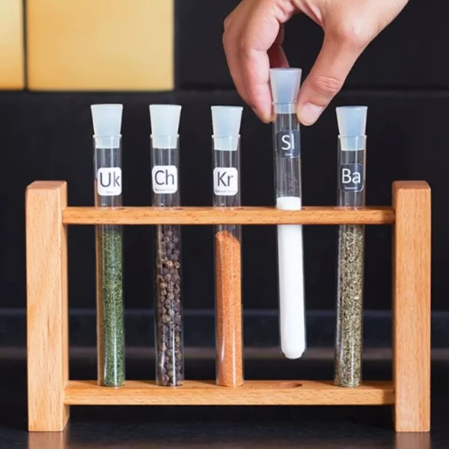 Прекрасное сочетание стиля, качества и оригинальной идеи. В набор входит деревянная подставка под пробирок, сделанная вручную, 5 пробирок (+1 запасная), 5 черных силиконовых крышечек и набор наклеек со всевозможными названиями приправ и специй. Наклейки стилизованы под периодическую систему элементов и обозначены большими буквами с расшифровкой, например: Og (орегано), Ch (черный перец) или Co (корица) - всего 36 наиболее распространенных специй. Благодаря высокому качеству наклейки, если вы захотите ее сменить, то она легко снимается с пробирки и на ее место клеится новая.