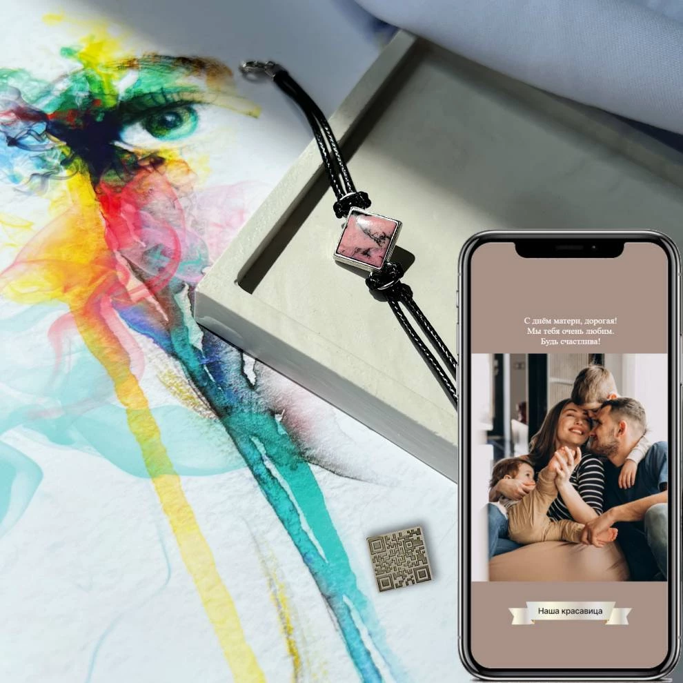 Этот уникальный браслет с благородным камнем таит в себе Hi-tech секрет - на задней части камня находится QR код. Если его отсканировать с помощью камеры телефона, то откроется специальный сайт, куда вы можете загрузить фотографию всей семьи с пожеланием для бабушки. Современное переосмысление классического подарка!